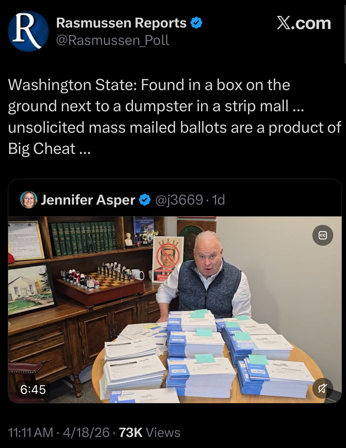 No one has been held accountable for an extremely fraudulent voting system that few Americans trust and, in my view, the U.S. postal service should not be allowed to have anything to do with our voting processes.