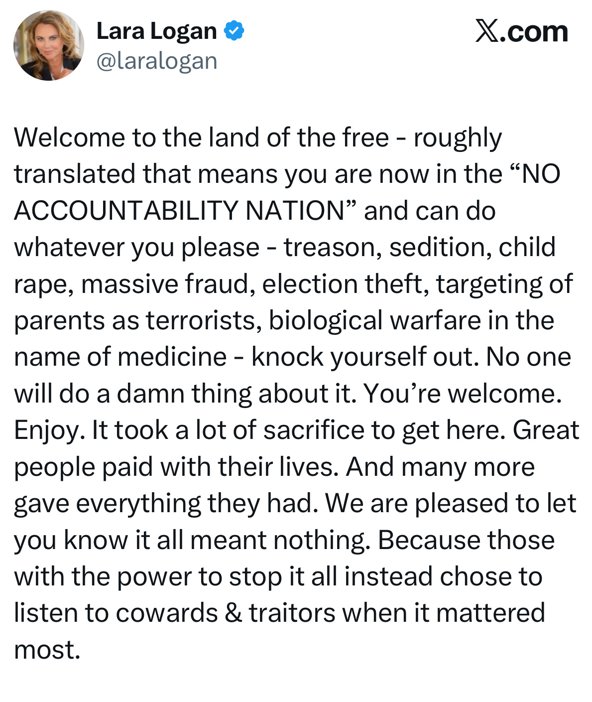 Real change has never come from the powerful but from courageous citizens who refuse to look away. If we want a Republic worth passing on, we must demand truth, insist on justice, and hold every leader to the standard our Founders built this Nation on.